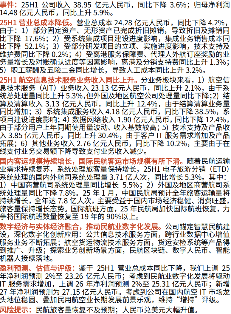 报告标题:《国内民航客运市场规模持续增长,民航业数字化发展不断推进——中国民航信息网络(0696.HK)2025年中报点评》